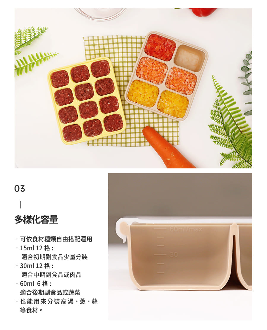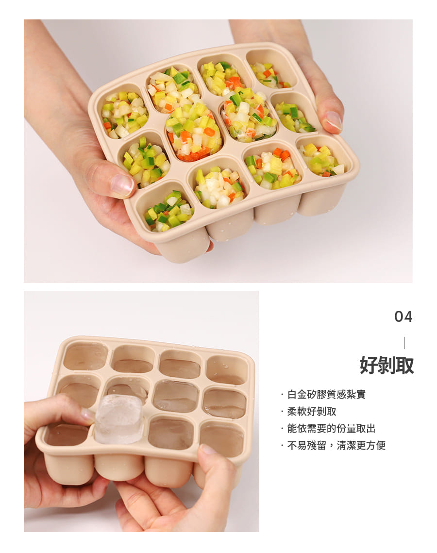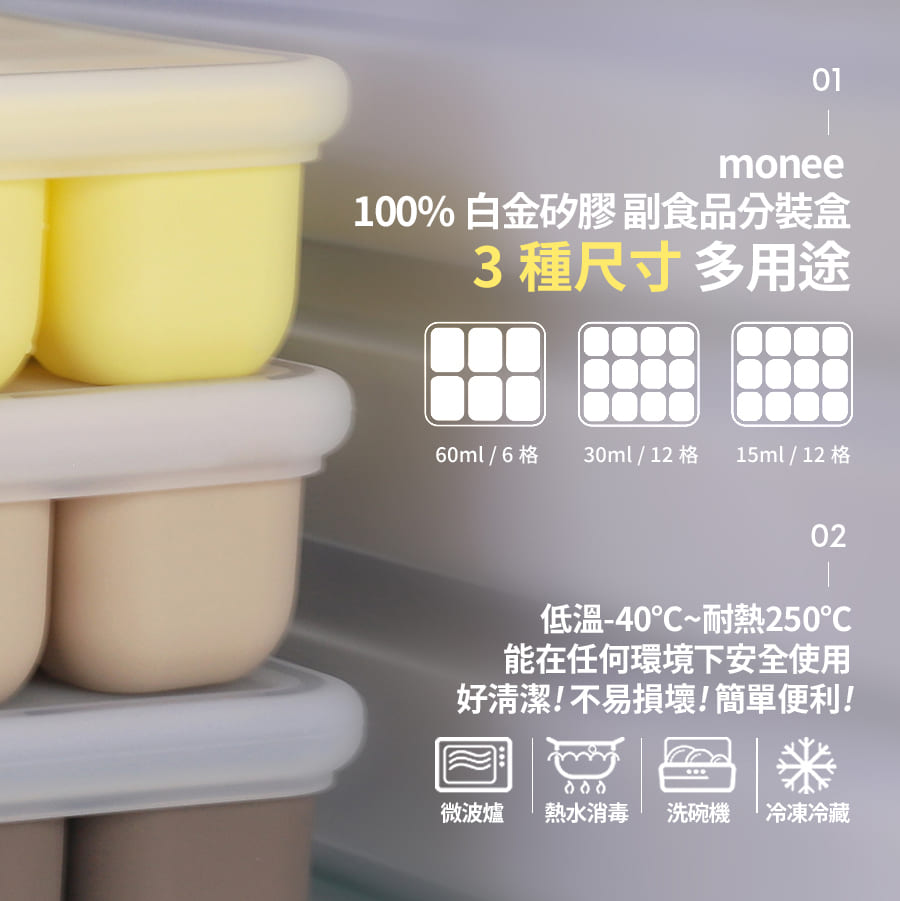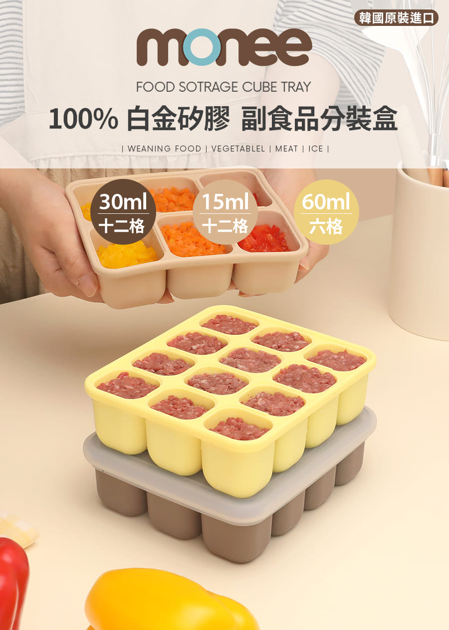 韓國副食品分裝盒,共有3種尺寸,小菜佐料、斷奶期副食品等皆可廣泛使用,保鮮省時,底部按壓即可快速取出冷凍冰磚,密封設計可有效隔絕氣味,確保食物新鮮,更是製冰、製作點心等料理小幫手,不同容量可供日常變化使用。