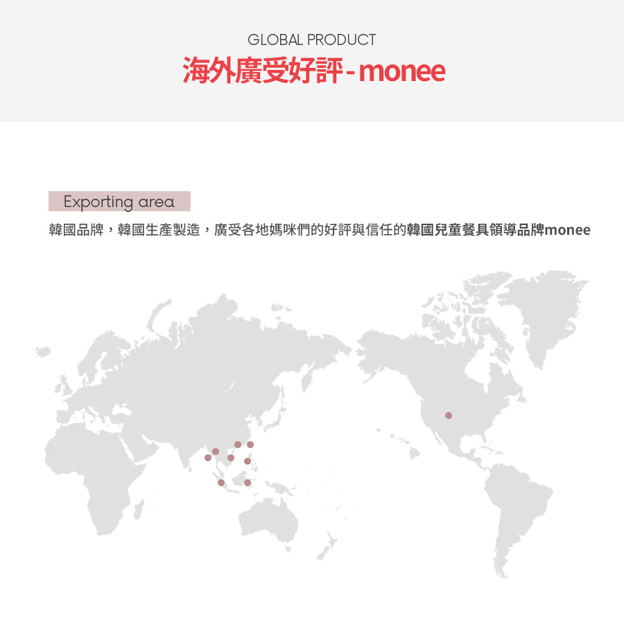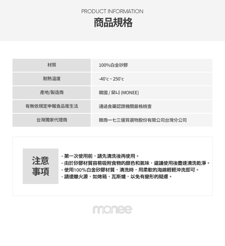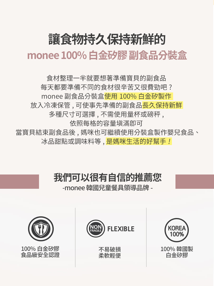 monee是來自韓國最頂級的兒童矽膠餐具品牌,以白金矽膠(Platinum silicon)作為安全無毒可使用性之食器類 (不含雙酚A、不含塑化劑、不含聚氯乙稀),100%高純度白金矽膠是monee不易變形的主要原因,有別於它牌高出了1.5~2倍,耐熱(冷)層級更從-40度到250度差距之多,高質量更榮獲食器類最高等級的德國LFGB認證及美國FDA、歐洲EN14372等國際認證,確保商品達到最高安全標準。在任何環境下皆可方便父母們快速清洗,並同時給予寶寶安全的使用。以「安全育兒、安心至上」為設計理念的韓國monee是給予繁忙於城市生活的父母們,最安心的育兒品牌首選。